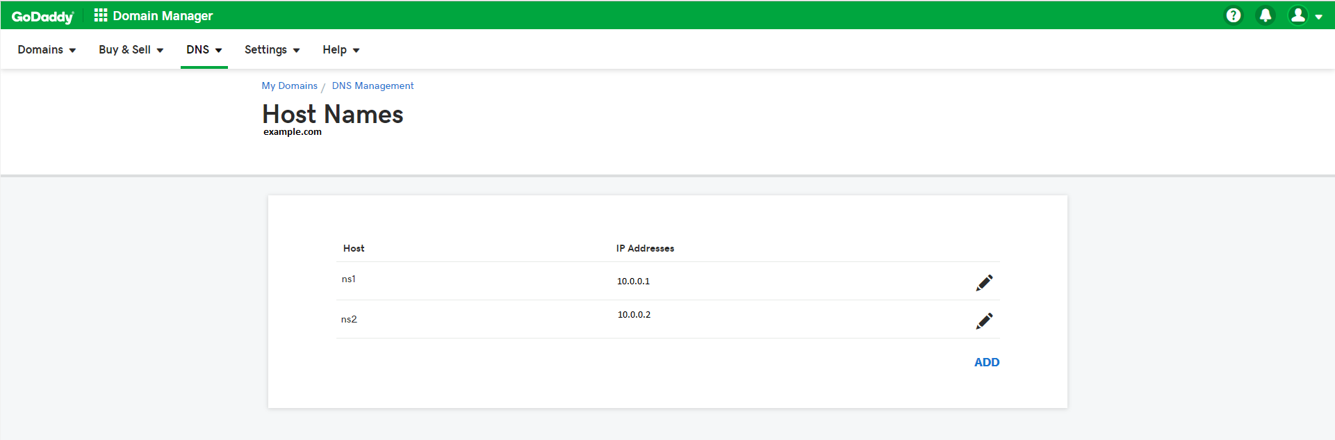 - On the “Host Names” page that loads (My Domains > DNS Management > Hostnames) it will say “Hostnames let you use your domain — instead of an IP address — to identify your name servers.” click on the “ADD” hyperlink to the right